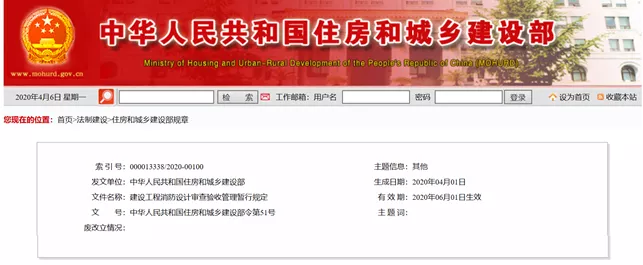 2019年5月10日,司法部法制信息網公開征求意見系統,面向全社會公開征求《建設工程消防設計審查和驗收管理規定(征求意見稿)》意見。時隔半年后,標題最終修改為《建設工程消防設計審查驗收管理暫行規定》(以下簡稱《規定》),并于2020年4月4日,已經住房和城鄉建設部部務會議審議通過,以住房和城鄉建設部令第51號發布,并自2020年6月1日起施行。新規明確了履行消防設計審查驗收,備案抽查職責的同時,增加了優化營商環境、工程建設項目審批制度改革等內容。