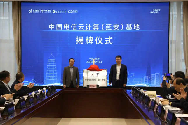 簽約儀式上,市委常委、副市長劉曉軍和電信陜西分公司總經理葉利生代表雙方為中國電信云計算(延安)基地揭牌。