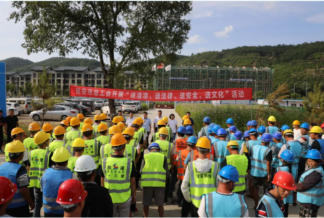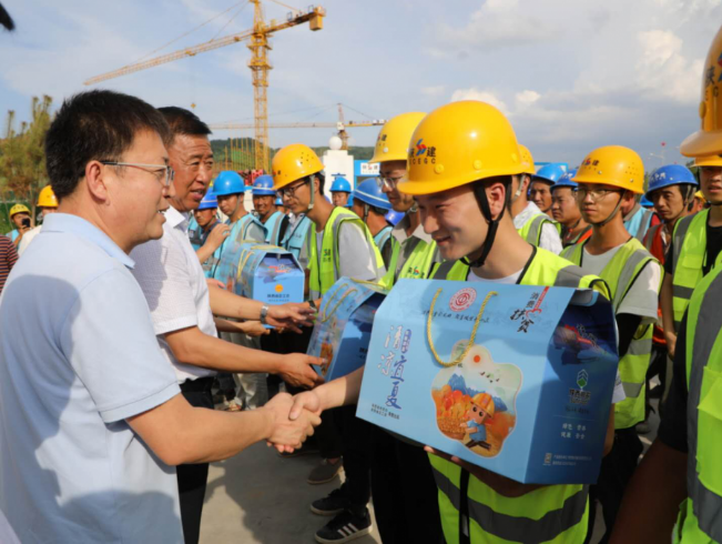 8月10日,延安市政協副主席、市總工會黨組書記、主席黑樹林一行來到陜建十三建公司南泥灣紅色文化小鎮項目慰問項目一線建設者,為他們送去茶葉、蜂蜜、綠豆、小米等防暑降溫物品。市總工會副主席、女職委主任鄭艷霞,南泥灣開發區黨工委副書記折克銀,市總工會辦公室副主任、困難職工幫扶中心主任惠瑞國,市總工會辦公室副主任、宣教部負責人康靖華,陜建十三建公司紀委書記、工會主席張軍祥出席活動。