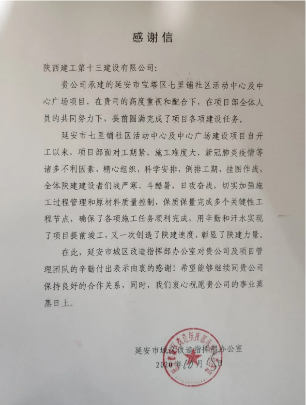 在繼南川河防洪工程、延安大學新校區體育中心項目之后,10月15日,公司負責施工的延安市七里鋪社區活動中心及中心廣場項目收到了來自建設單位的感謝信。延安市城區改造指揮部在感謝信中提到:陜建十三建公司延安寶塔區七里鋪社區活動中心及中心廣場項目全體建設者戰嚴寒、斗酷暑,日夜奮戰,切實加強施工過程管理和質量控制,保質保量完成了多個關鍵性工程節點,確保了各項施工任務順利完成,用辛勤和汗水實現了項目提前竣工,又一次創造了陜建速度,彰顯了陜建力量。
