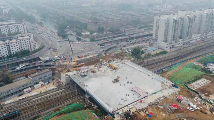 據(jù)了解,西安太華路立交橋建于1992年,橋長22米,寬34米,位于西安火車站東咽喉區(qū),跨隴海鐵路上下行正線。西安太華路立交橋改擴(kuò)建項(xiàng)目,是西安火車站改擴(kuò)建工程的重要環(huán)節(jié)、南北站場改建的控制性工程。按照西安市政規(guī)劃,該橋改擴(kuò)建后為兩跨三幅,橋長65米,寬63米,箱梁44片。因舊橋拆除、新橋建設(shè)均在隴海鐵路營業(yè)線或鄰近營業(yè)線施工,施工難度大、安全風(fēng)險(xiǎn)高。