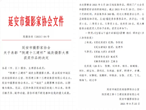 “陜建十三建杯”城改攝影比賽旨在用相機展示古城風貌,以鏡頭凸顯圣地氛圍,展現新時代之下延安市的發展之美、和諧之美。影賽自開展以來,得到了廣大攝影愛好者的積極參與、踴躍投稿,共收到攝影作品350余幅,經過攝影協會專業評委嚴格公平評選,共評選出一等獎作品1幅,二等獎作品2幅,三等獎作品3幅,優秀作品20幅。