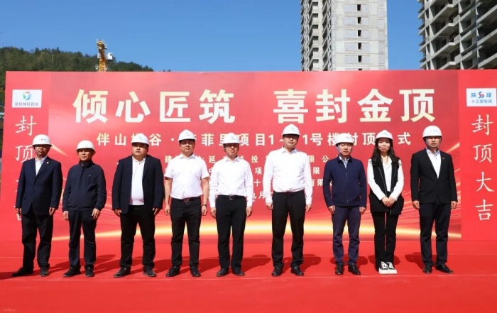 延安城投集團副總經理、延安城投置業公司董事長薛永華,陜建十三建集團副總經理楊永宏,中建鼎正項目管理公司伴山樾谷·芳菲里項目總監理工程師馮福榮等出席封頂儀式。