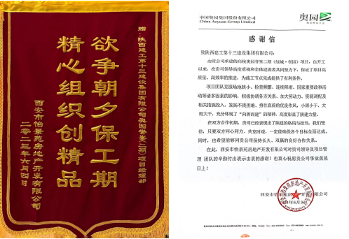 信中提到,陜建十三建集團自承建奧園譽峯(二期)項目以來,重合同、守信用,各項管理工作有序開展,項目建設穩步推進。在項目建設期間,項目全體參建人員認真籌劃部署,緊盯目標任務,抓進度趕工期,主動攻堅克難,增加資源投入,積極配合工程業主、監理單位和行政管理部門,以不畏艱難、勇挑重擔的精神,為施工節點完成提供了有利條件。
