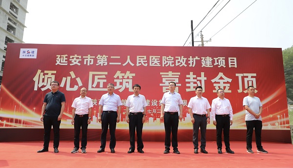 傾心匠筑·喜封金頂。7月20日,由陜建十三建集團(tuán)承建的延安市第二人民醫(yī)院改擴(kuò)建項(xiàng)目順利封頂。