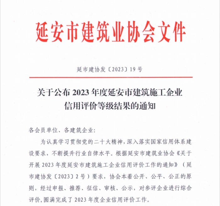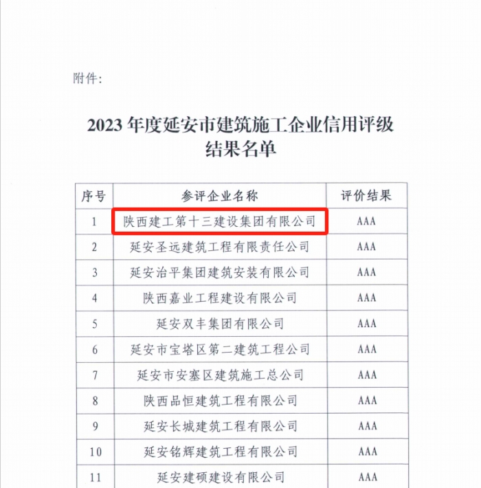 同時,延安市建協公布了2023年度延安市建筑施工企業信用評級結果:陜建十三建集團被評為AAA級企業。
