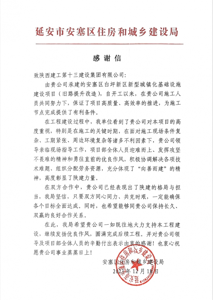 近日,集團第一工程公司施工的安塞區白坪新區新型城鎮化基礎設施建設項目收到來自安塞區住建局的感謝信,對集團項目部管理團隊在施工過程中的迎難而上、攻堅克難,高質量、高效率推進項目建設予以高度贊揚。